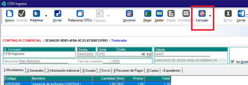 Ahora identificamos la factura que deseamos cancelar y entramos a ella con doble clic.