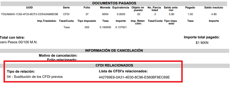 Se desea cancelar complemento de pago, donde los datos son los siguientes: