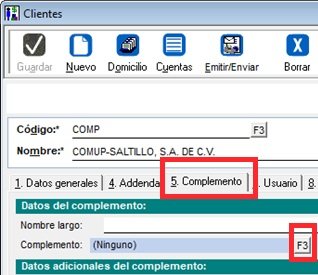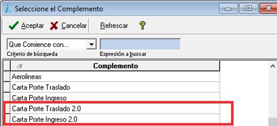 Al dar clic en la palabra ninguno aparecerá el botón F3, al dar clic en el botón aparecerá el catálogo de complementos. Donde elegirás el correspondiente a tu operación, recuerda elegir la versión 2.0: